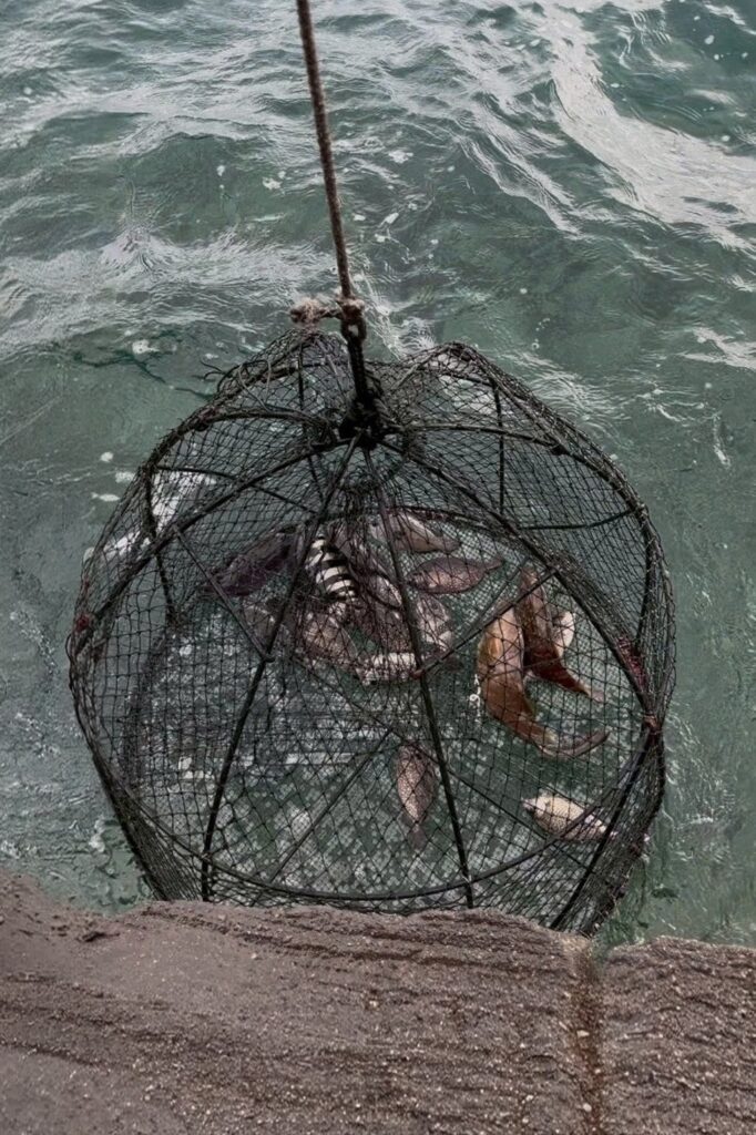 「もんどり」というカゴを海に沈めておき、魚を捕る仕掛けがあるのですが、幸洋丸さんの所にも設置されていました。引き上げてみると…