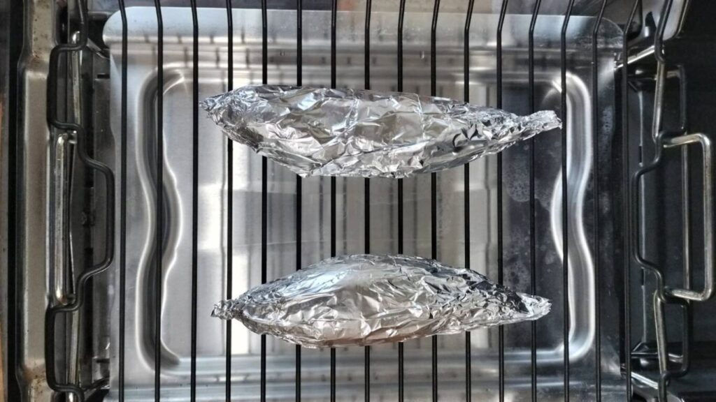 ホイルで包むことで焦げを防ぎ、蒸し焼き効果が生まれます。
